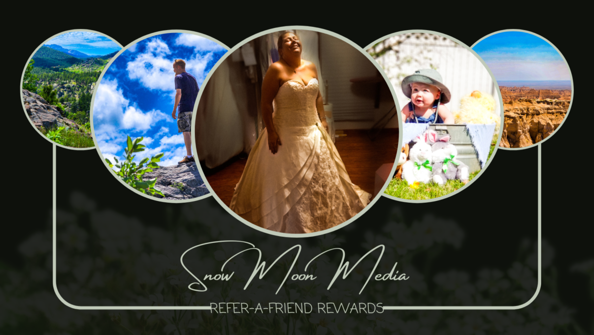 You CAN still refer clients even if you’ve never done business with Snow Moon Media LLC before. Simply send us an email letting us know you’re interested in referring someone. Include your full name, address and email address in the email. We will then provide you with a unique referral code and start tracking your referrals. This is a smart option for anyone interested in saving money on professional photography sessions with us.